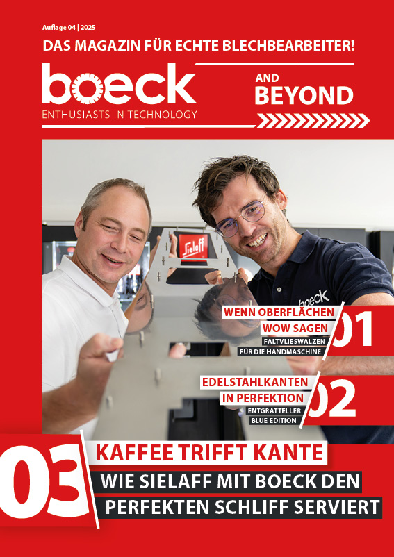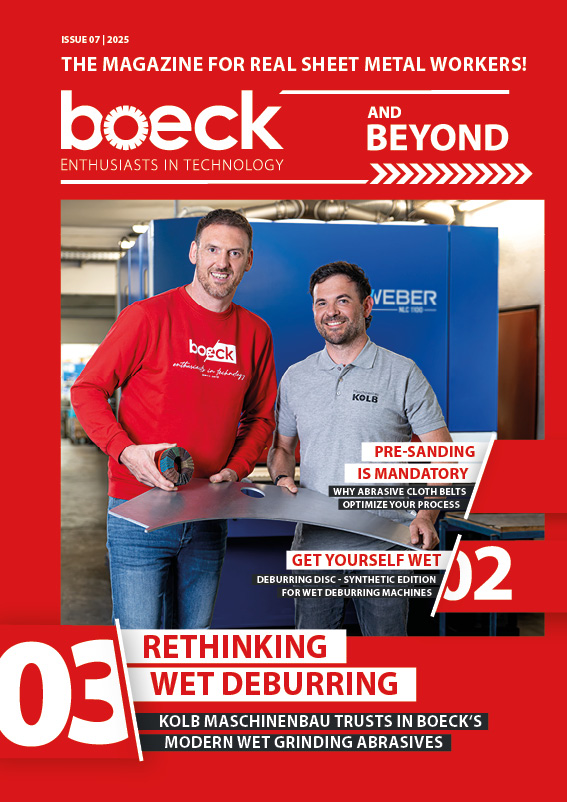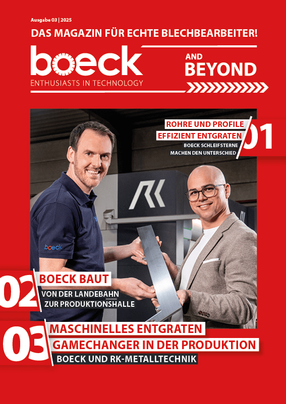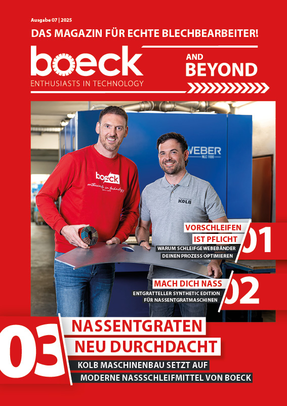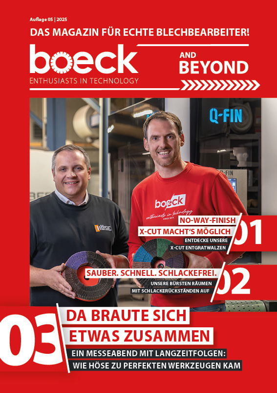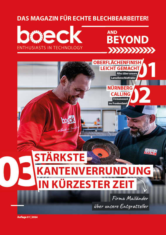 Das neue boeck Kundenmagazin gibt exklusive Einblicke in die Welt der Blechbearbeitung!In der aktuellen Ausgabe erwarten Sie spannende Themen wie unser Firmenevent, innovative Lamellenschleifräder und wegweisende Entgrattechnologien.Erfahren Sie, wie Unternehmen wie Mailänder Industrietechnik mit unseren Lösungen ihre Prozesse optimieren. Zudem gibt’s Einblicke in unsere neuesten Entwicklungen für perfektes Oberflächenfinish.Jetzt entdecken und in spannende Geschichten aus der Welt der Blechbearbeitung eintauchen!